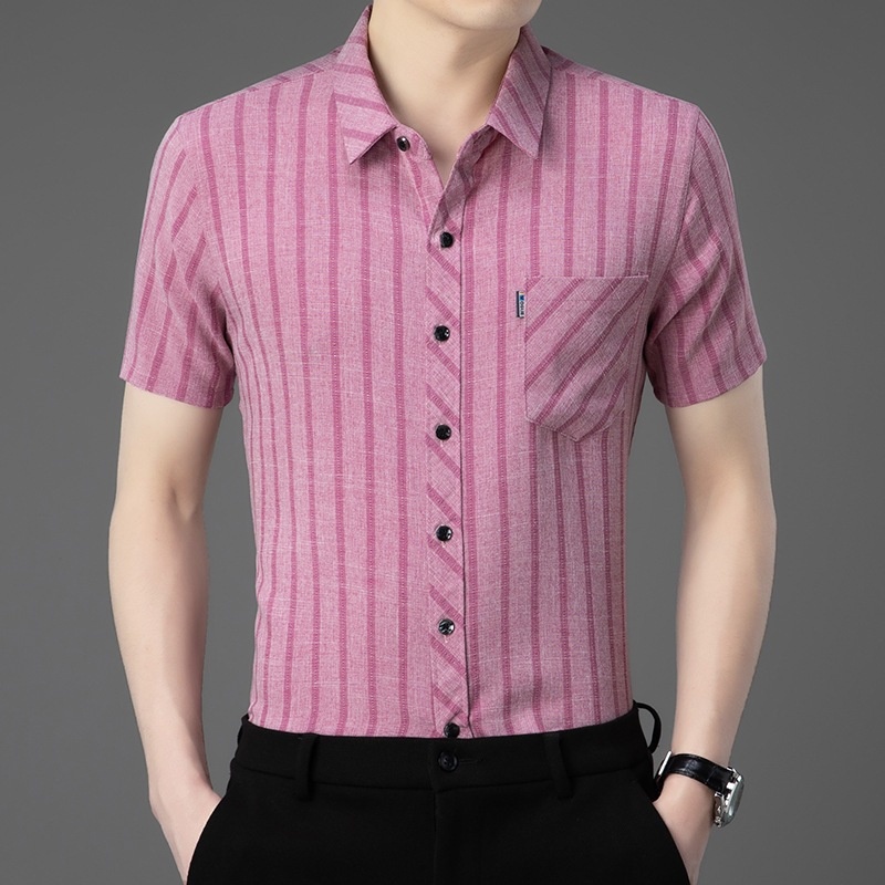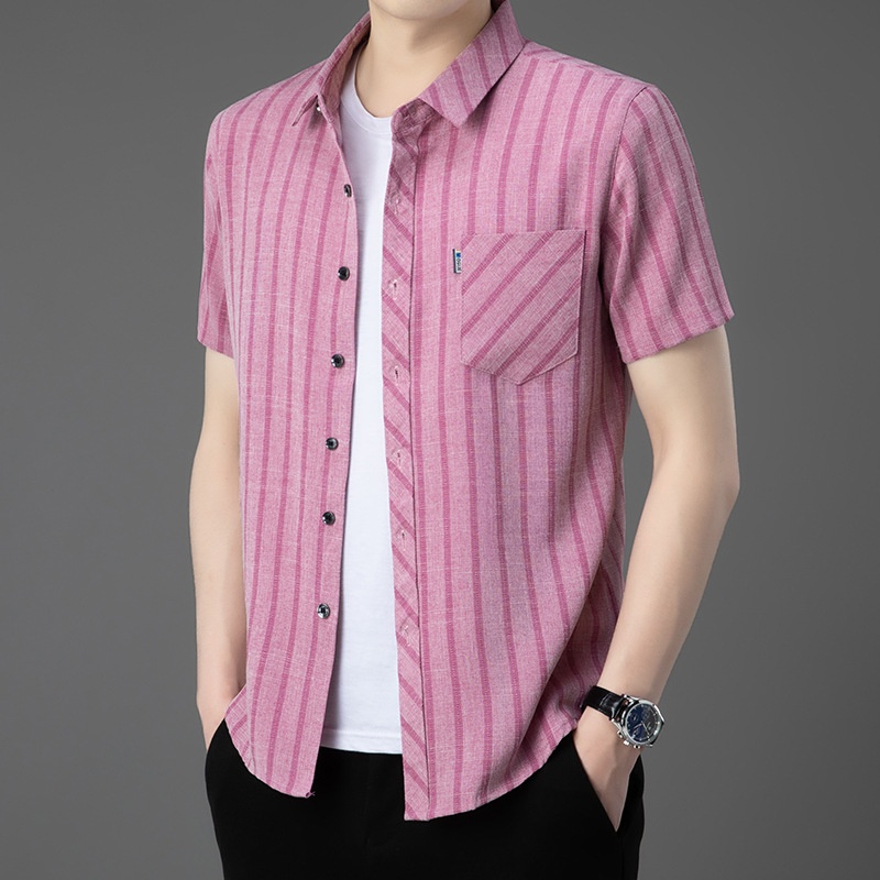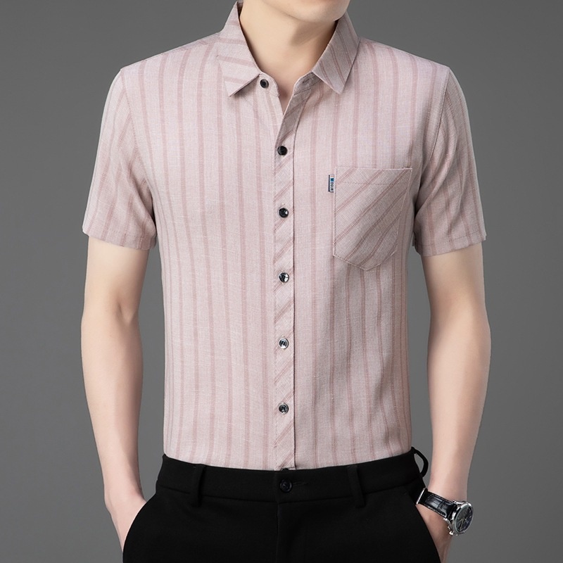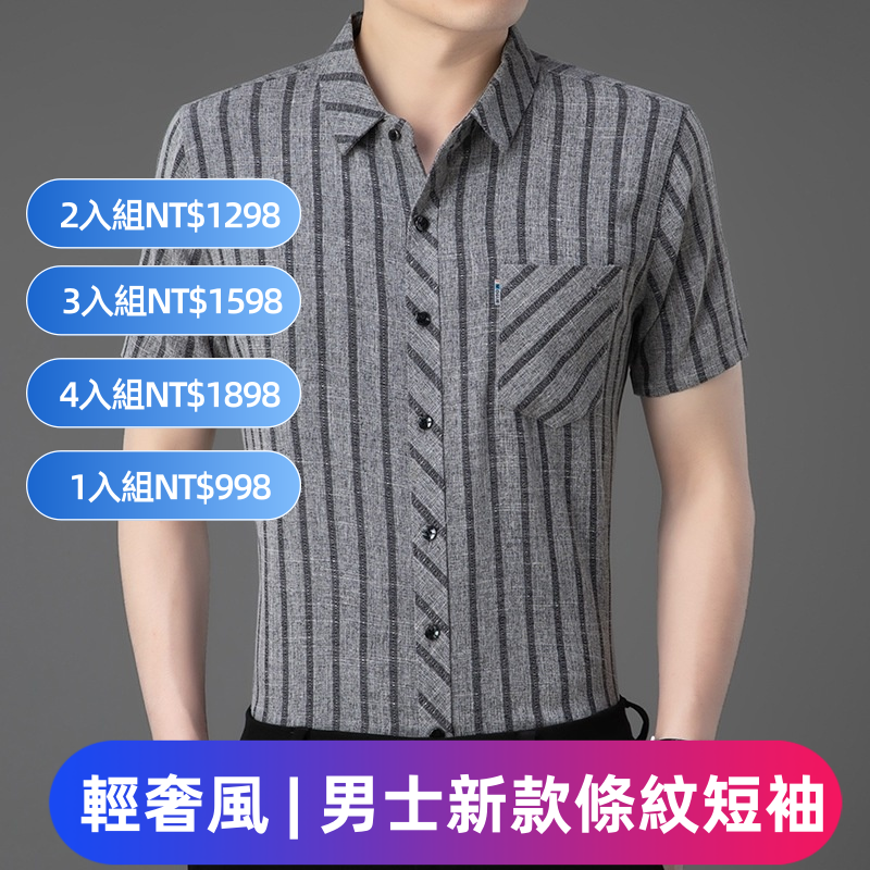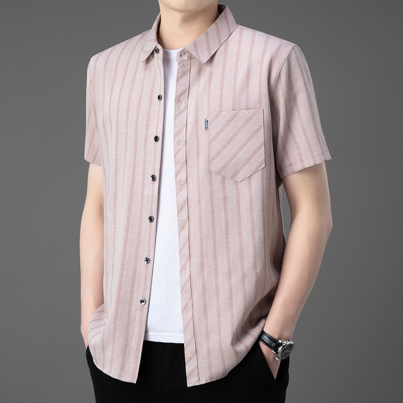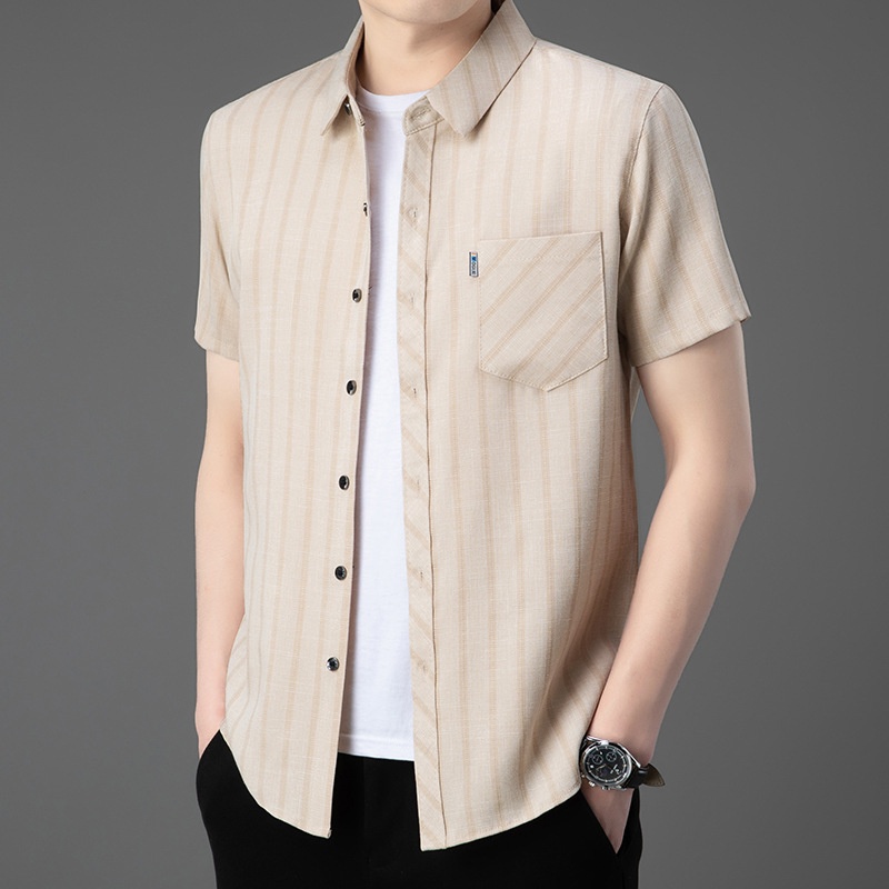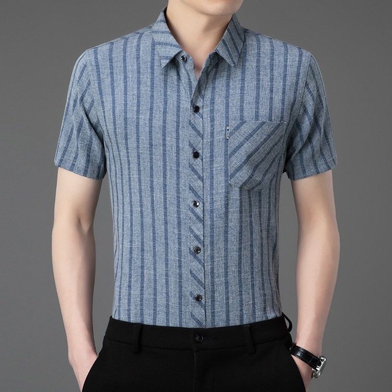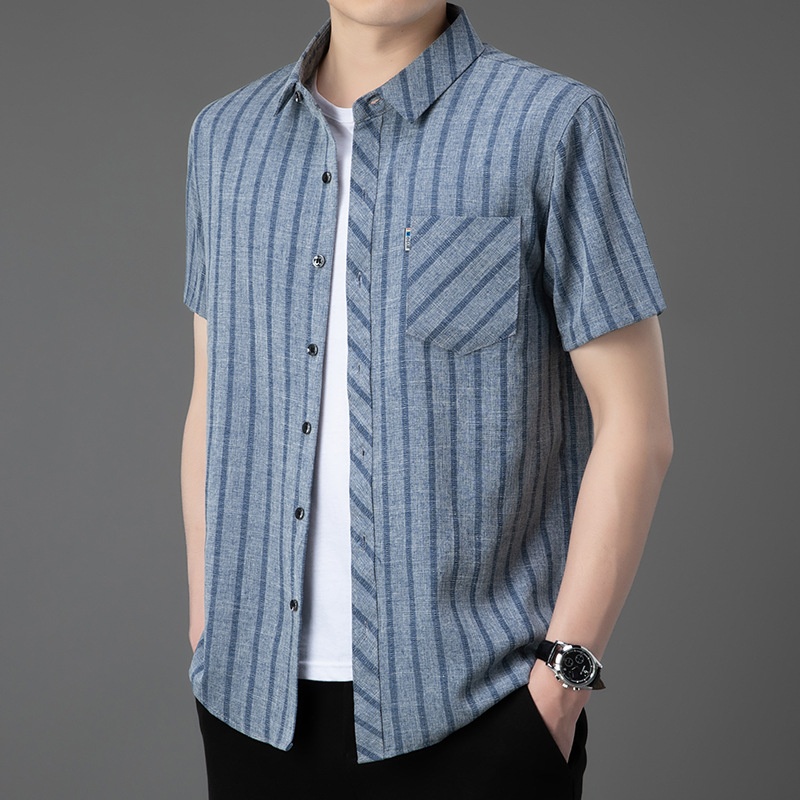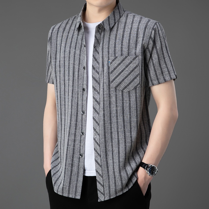 ·輕奢風,男士新款夏季條紋短袖,亞麻中青年條紋薄款,合體型真口袋翻領襯衫!